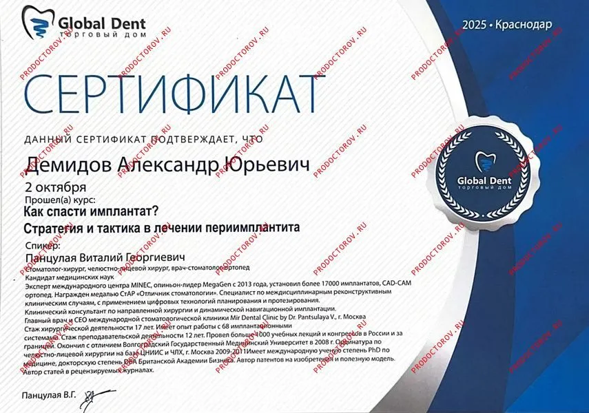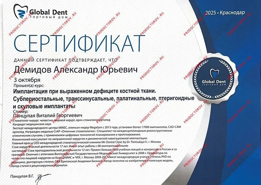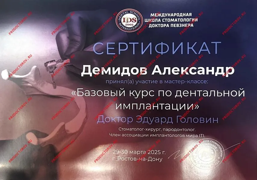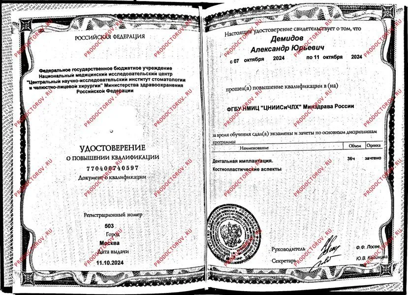 2024 г. Повышение квалификации в ФГБУ НМИЦ «ЦНИИСиЧЛХ» Минздрава России по дисциплинам «Дентальная имплантация», «Костнопластические аспекты»